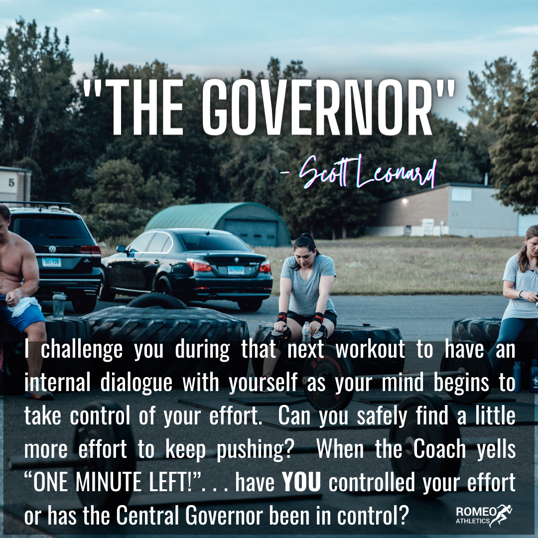 I think we all continually search for ways to get better in our fitness journey’s, that is why you come to Romeo Athletics. We all talk about workouts, we talk about form while moving, we talk about nutrition, we talk about sleep patterns, we talk about stress levels and a whole lot more. I challenge you during that next WOD to have an internal dialogue with yourself as your mind begins to take control of your effort. Can you safely find a little more effort over the course of the WOD? When the coach yells “ONE MINUTE LEFT!” have YOU controlled your effort or has the Central Governor been in control?